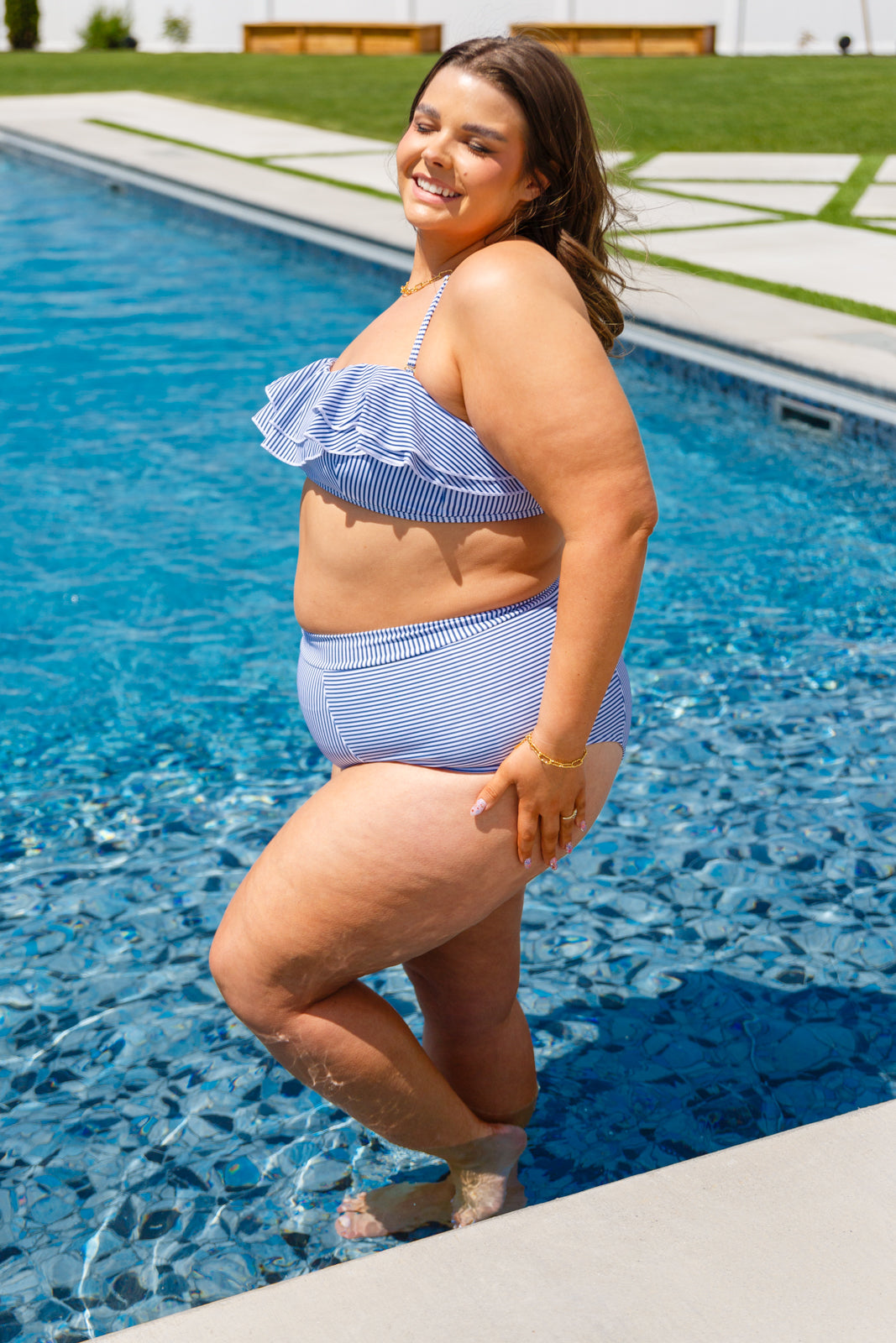 We hope you love the Ride The Wave Swimsuit Bottoms as much as we do! With a high waist silhouette, full coverage, and a dainty blue and white pin striped pattern throughout, these cute bottoms will quickly become your fav!