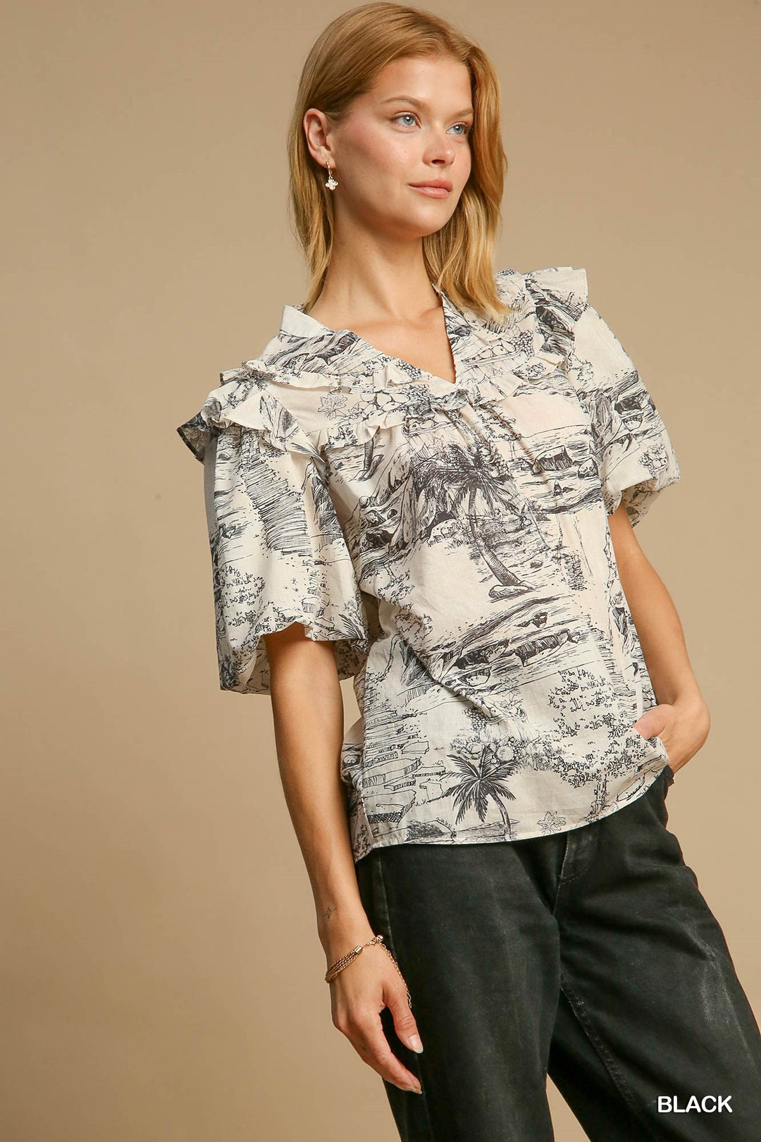 Time Goes By Texture Fabric Ruffle Sleeve Button Down Tiered Top