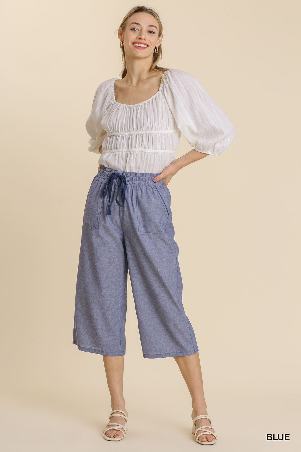 Embrace effortless warmth-weather style with these cropped chambray pants, expertly designed for relaxed comfort. The loose fit allows unrestricted movement, while the drawstring waist provides customizable support and a refined silhouette. Crafted from breathable chambray fabric, they're ideal for spring and summer wear—pair them with a simple tee for casual outings or dress up with a linen shirt for elevated occasions. A versatile wardrobe essential that transitions seamlessly from day to evening.