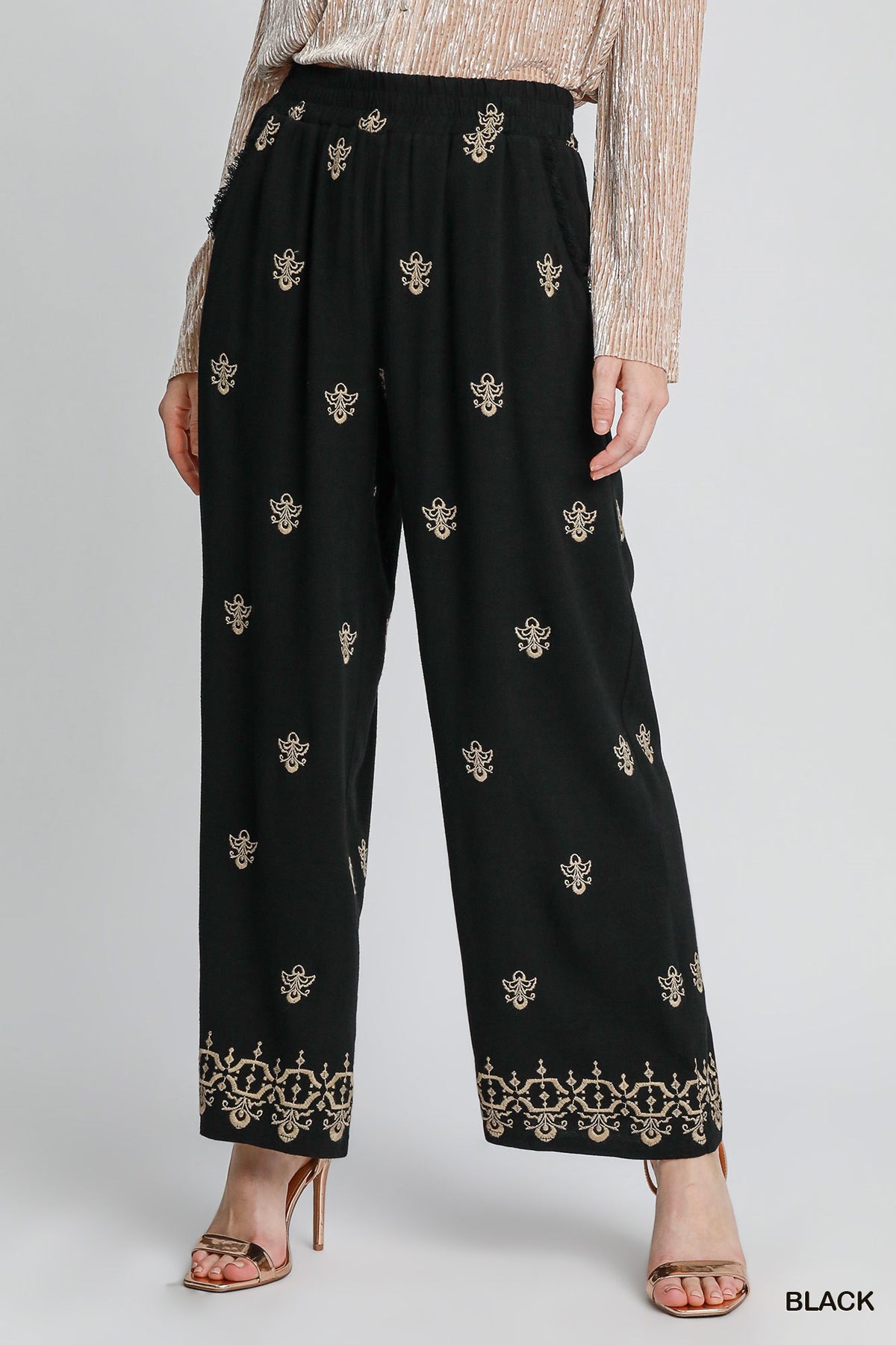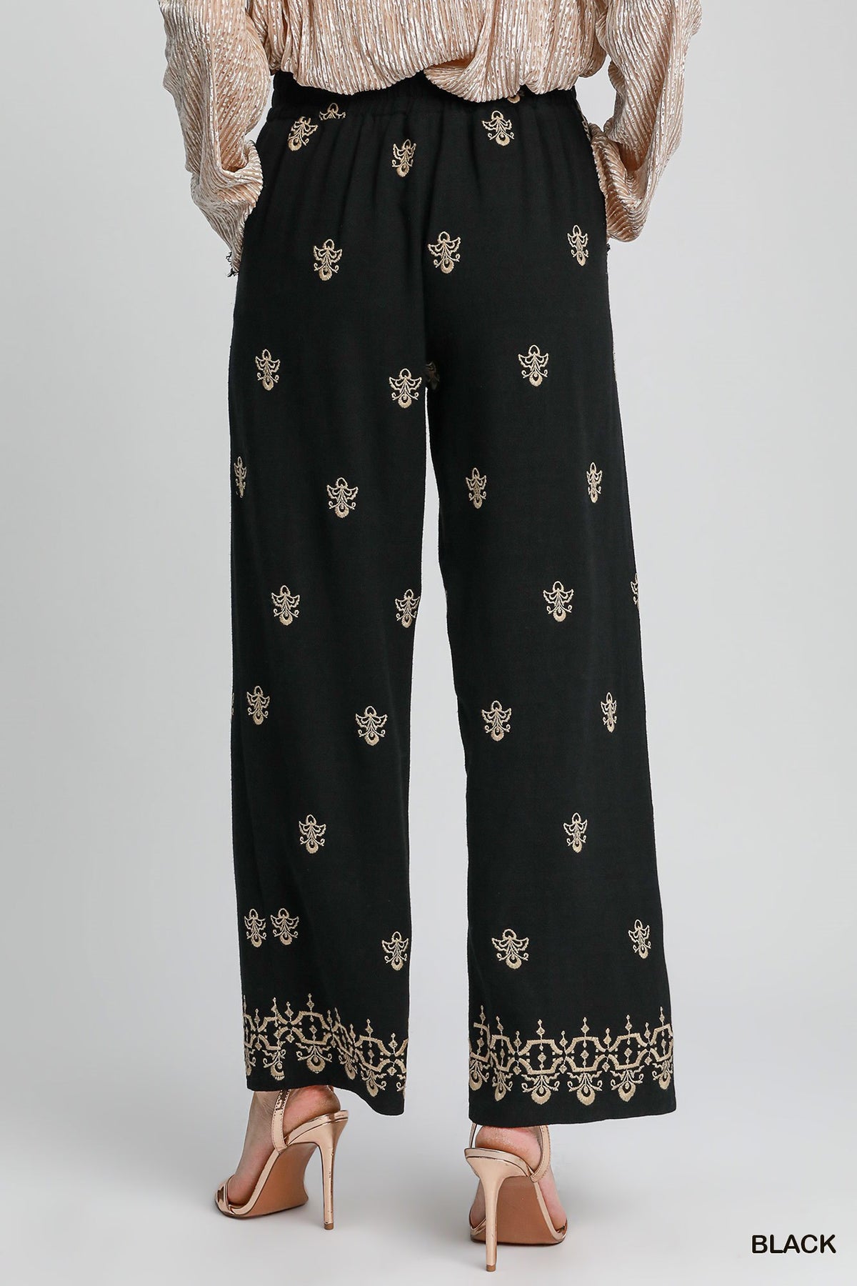 Elevate your wardrobe with these sophisticated linen blend wide leg pants, crafted for effortless style and all-day comfort. The black silhouette features delicate embroidered details that add an artisanal touch, while the breathable linen blend keeps you cool and composed. The relaxed wide leg cut flatters every frame and transitions seamlessly from casual to polished—pair with heels for evening elegance or flats for laid-back sophistication. A versatile boho essential that embodies timeless, understated luxury.