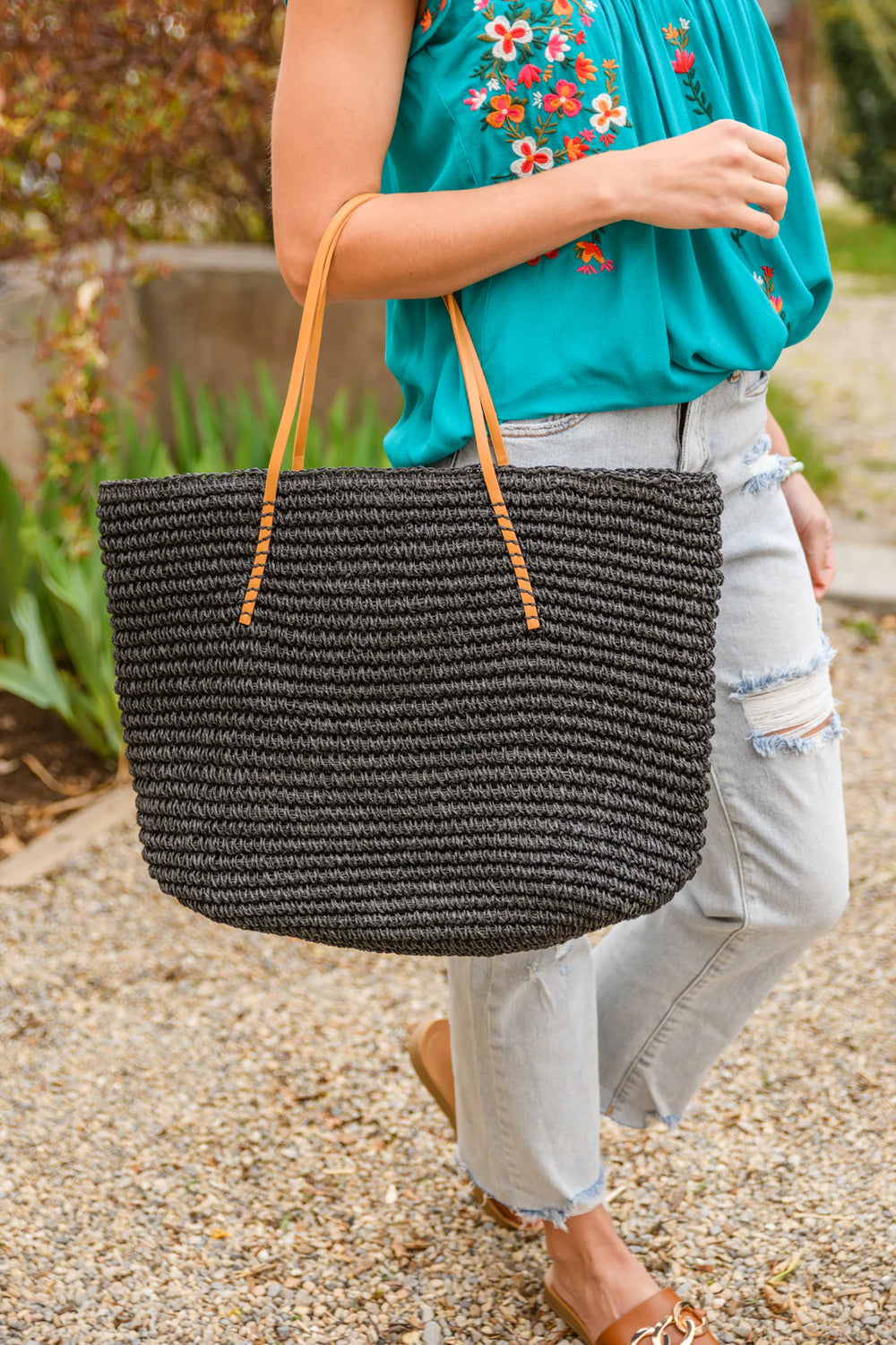 On sunny days at the beach or walks along the pier, the Beach Bag In Black will be the perfect accessory. This woven tote features a large compartment that is fully lined, with two inner patch pockets, zipper closure, and twin faux leather handles.