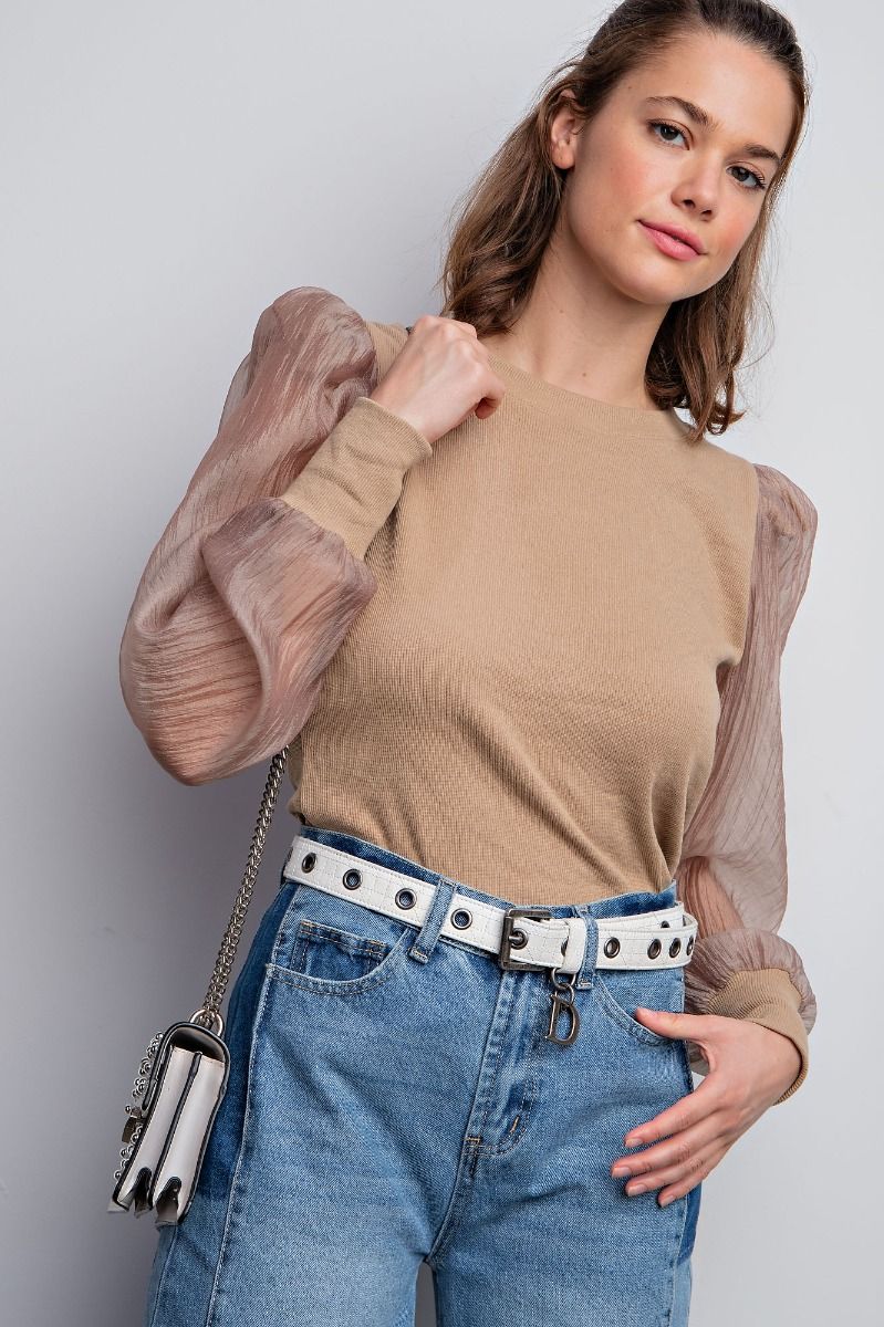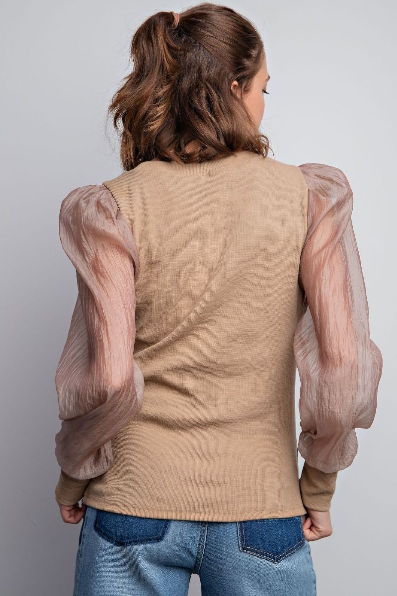 Experience a beautiful moment in our Ribbed Knit Top in Beige. Featuring elegant organza puff sleeves, a rounded neckline, and ribbed band cuffs, this top offers a slim and relaxed fit. Elevate your style with this versatile and chic addition to your wardrobe.